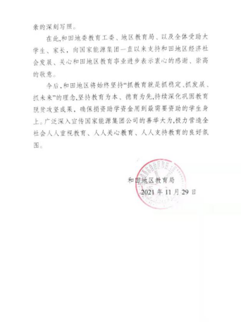 2021年年关岁尾,一封来自新疆和田地区教育局的感谢信,让基金会备受鼓舞。