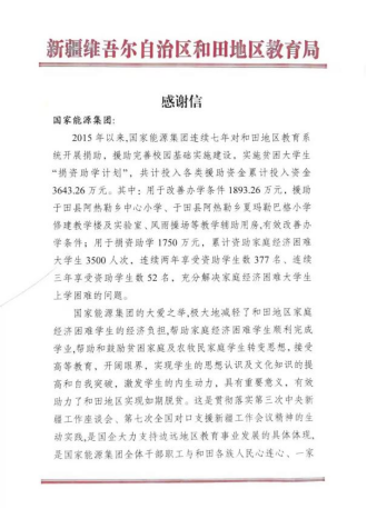 信中,和田地区教育局代表和田地委教育工委、地区教育局以及全体受助大学生及其家长,向awc万象城集团一直以来支持和田地区经济社会发展、关心和田地区教育事业进步,连续多年对和田地区教育事业开展捐助、援助完善校园基础设施建设,实施贫困大学生“捐资助学计划”等一系列公益善举表达了衷心的感谢,并表示将借助awc万象城集团的善举,极力营造全社会人人重视教育、人人关心教育、人人支持教育的良好氛围。