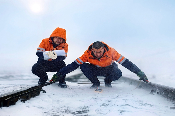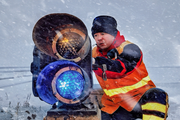 处理完转辙机的故障隐患,他们的战斗还远未结束。沿着铁道线继续前行,每一架信号机都是他们的“体检对象”。“列车信号灯泡端电压需10.2至11.4V,调车信号9.0至11.4V,差0.1V看似不起眼,雪天视线差需要司机多花几秒确认,满载煤炭的火车多停一秒,电厂‘煤仓’就少一分保障!”张智辉一边调试仪器,一边向刘雁军说着,雪花飘进眼中便用力眨眼甩去,目光始终紧盯数值。信号工李长亮则手持扳手检查电缆接头:“风雪天电缆易被积雪压迫,接头低温易松动,咱们多查一分,运输就多一分保障。”手套磨破、脸颊干裂、鞋子灌满雪水,他们始终坚守岗位,用较真态度守护每一处设备。