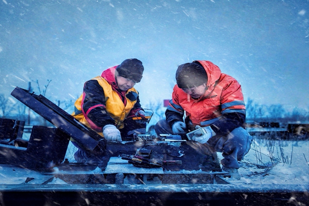 信号工李长亮和孙会立“扎”进雪堆,风力除雪机的轰鸣声刺破风雪,强劲气流卷起积雪形成漫天雪雾,瞬间将二人吞没。片刻之间,他们的工装、帽子、睫毛积满冰雪,化作移动的“雪人”,但目光始终紧锁道岔尖轨缝隙,确保积雪彻底清除,一丝残留便可能在低温下结冰,影响道岔正常转换。另一边,张智辉与年轻信号工刘雁军蹲在被积雪半埋的转辙机旁,机身上的冰凌在寒风中闪着冷光。张智辉戴着手套拂去积雪,雪水迅速浸透手套,刺骨寒意蔓延全身,他却专注清理直至设备轮廓显露。“线路接头被雪水浸湿易短路,这是重大隐患!”他打开机盖,用略僵的手指指向内部线路,与刘雁军一起拆接头、砂纸打磨、重新连接,每一步都谨慎专业。