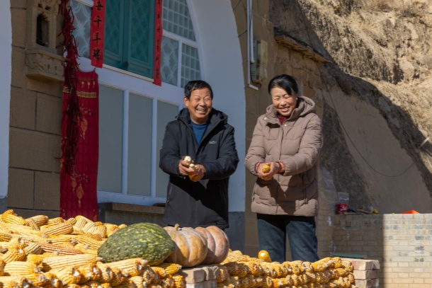 图为高乃柱正和老伴儿在自家院子里掰玉米