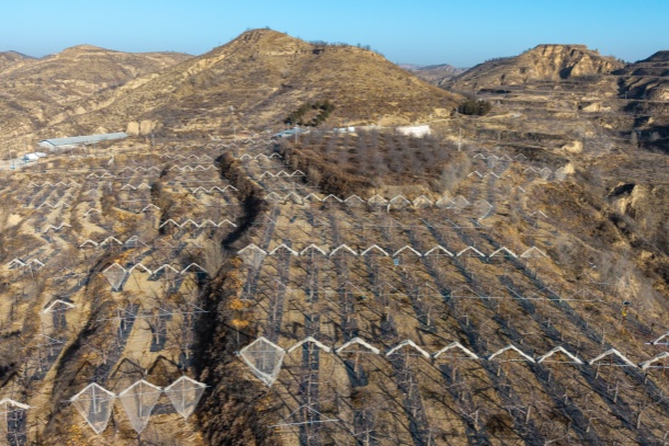 图为米脂县党塔村果农李志红的260多亩果园航拍